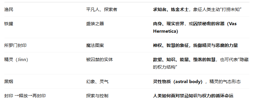 被囚的Jinn象征着原始能量与混沌力量:它若被正确使用,可以带来财富、知识与权力;也可以象征技术或知识的异化风险,封印解除后可能转化为失控灾难;或者是被压抑的集体潜意识(荣格意义上的“影子”),被压太久,便以毁灭者姿态重现。