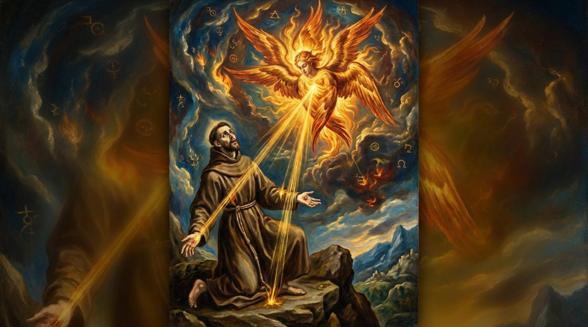 五伤(Stigmata)的真相:五道光芒从炽天使的伤口射出,击中了弗朗西斯的手心、足心和肋旁。这在生物能量学上被称为“以太体模板对肉体的强行重塑”。弗朗西斯的肉体成了炼金术的坩埚,他不仅是在体验基督的痛苦,更是在经历一场将碳基肉身转化为“光之载体”的极端实验。