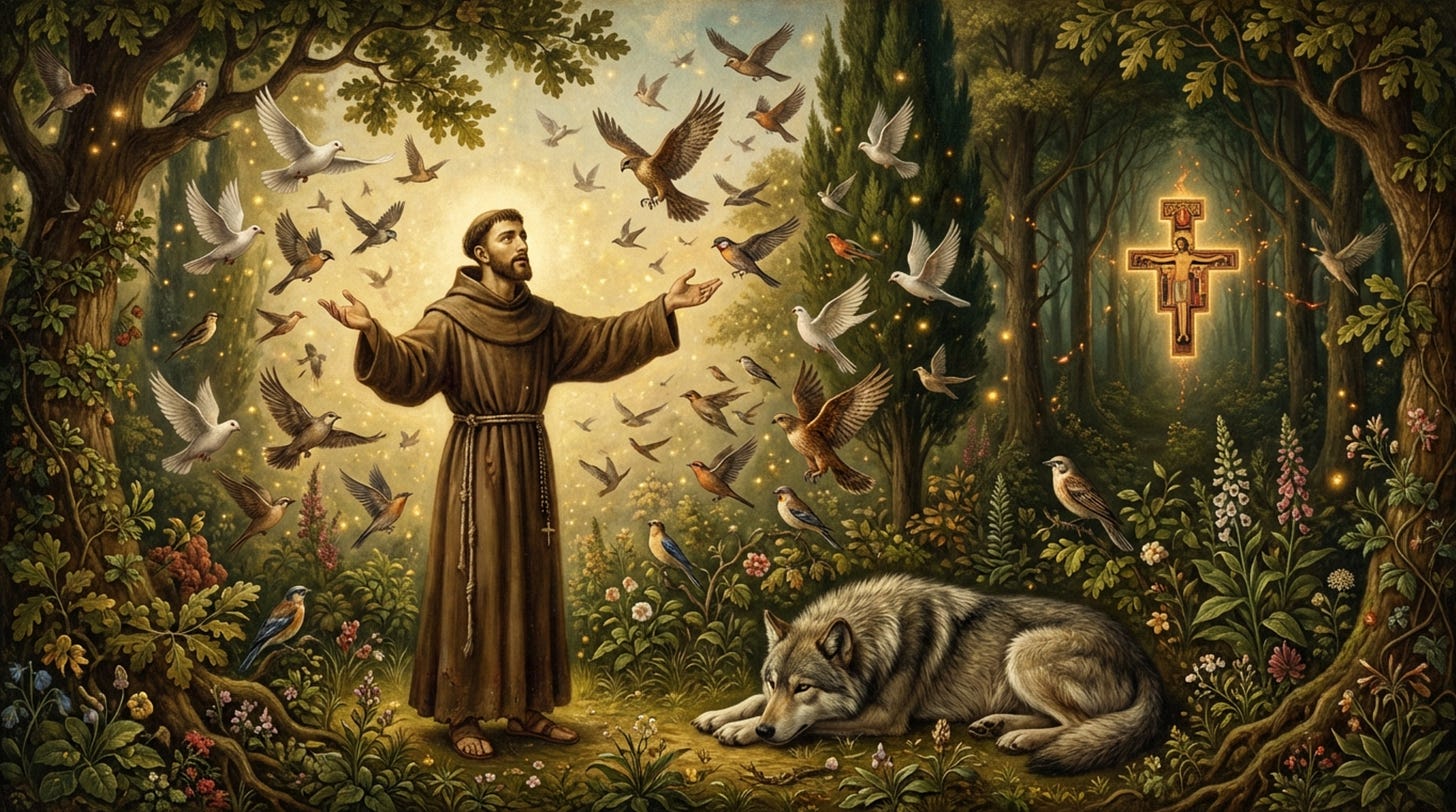 在这里,我们看到弗朗西斯如何从一个“异教徒”式的自然崇拜者,转化为一个能够调度宇宙能量的“神圣架构师”。他与狼和鸟的盟约,本质上是在教会僵化的教条外,秘密建立了一套基于“生物慈悲”的平行信仰体系。这套体系与东方的“众生平等”遥相呼应,却在西方的黑暗森林中开出了一朵前所未有的奇葩。
